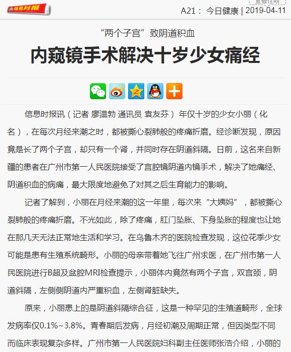 《信息时报》:内窥镜手术解决十岁少女痛经 2019年4月11日A21版