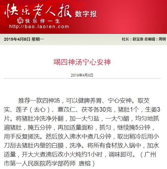 《老人报》:喝四神汤宁心安神 2019年4月8日A10版