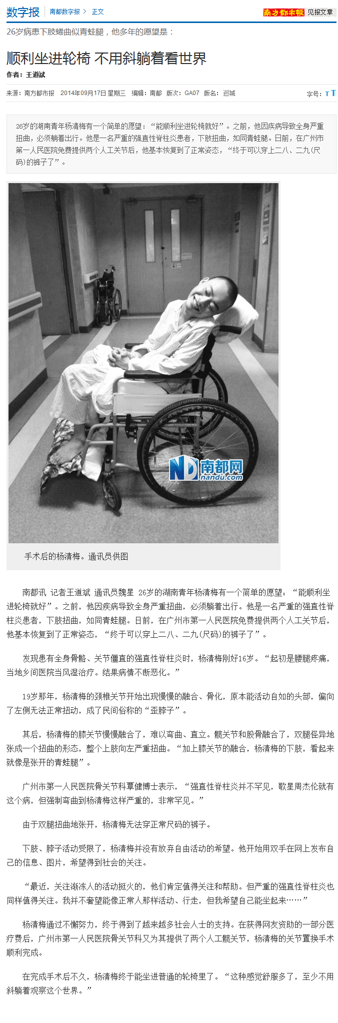 《南方都市报》:顺利坐进轮椅 不用斜躺着看世界 2014年9月17日AII07版