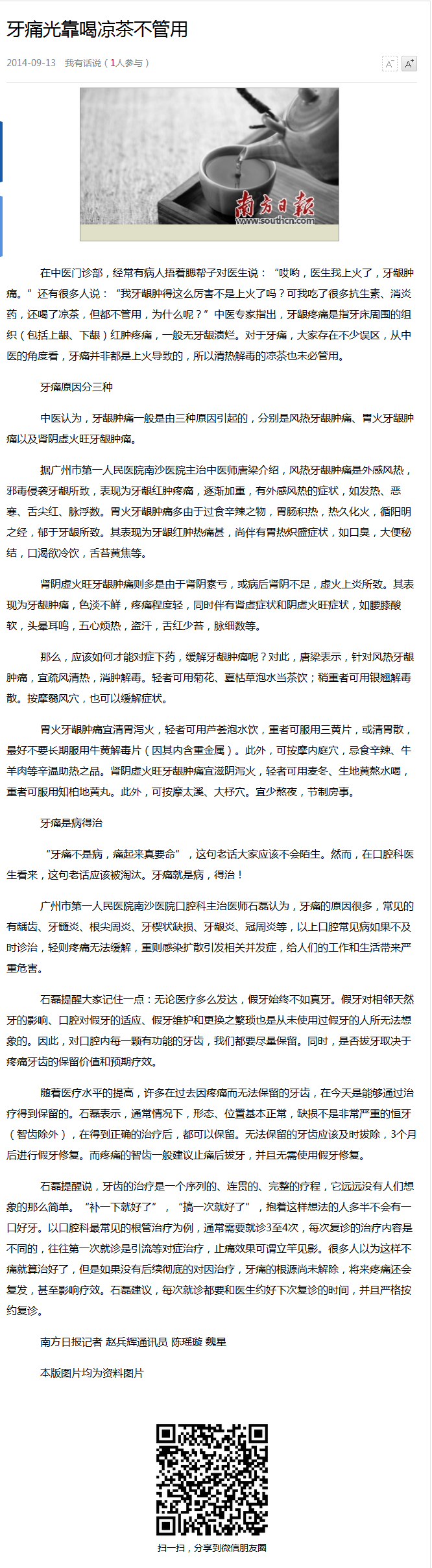 《南方日报》:牙痛光靠喝凉茶不管用 2014年9月13日A21版