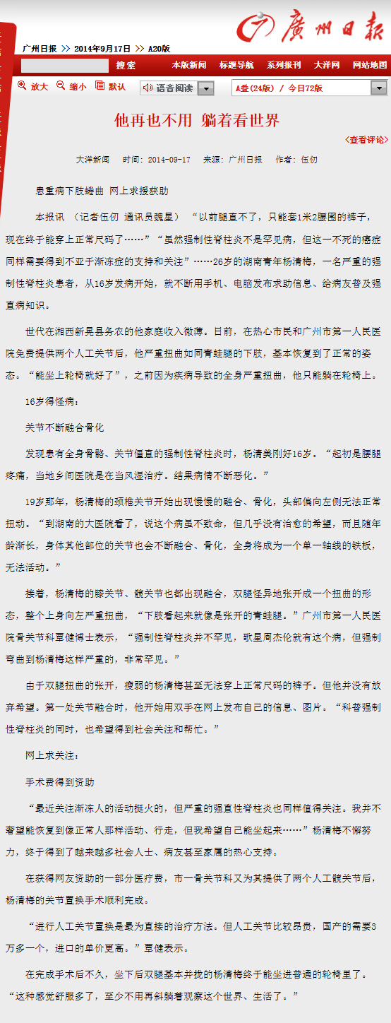 《广州日报》:他再也不用躺着看世界 2014年9月17日A20版