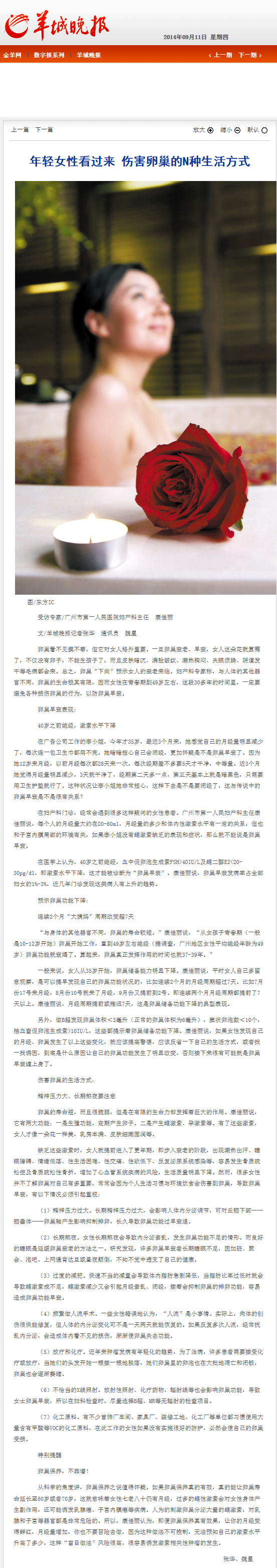 《羊城晚报》:年轻女性看过来 伤害卵巢的N种生活方式 2014年9月11日B05版