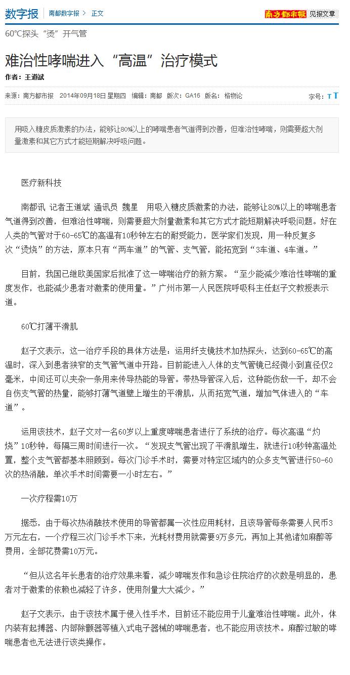 《南方都市报》:难治性哮喘进入“高温”治疗模式 2014年9月18日GA16版