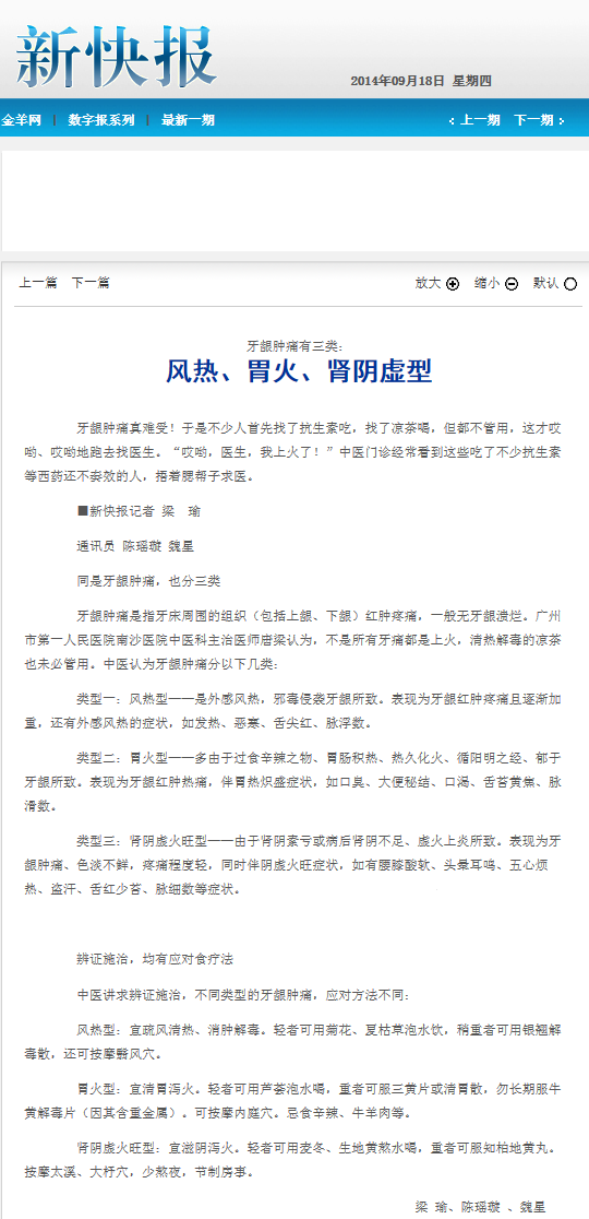 《新快报》:牙龈肿痛有三类:风热、胃火、肾虚型 2014年9月18日D04版