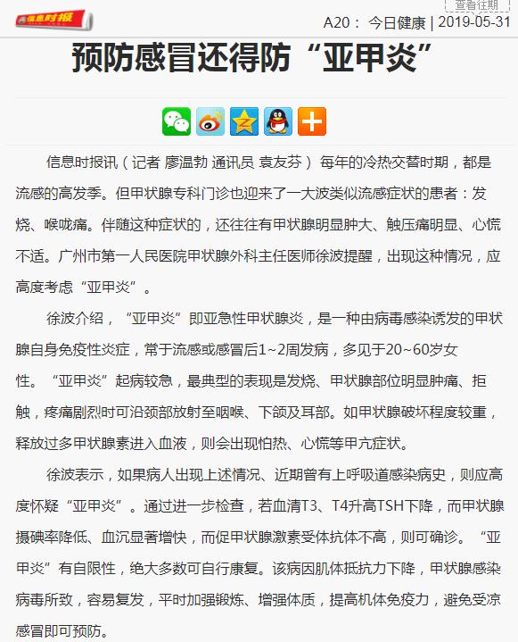 《信息时报》:预防感冒还得防“亚甲炎” 2019年5月31日A20版