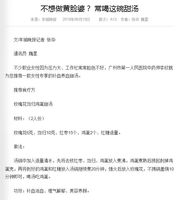 《羊城晚报》:不想做黄脸婆? 常喝这碗甜汤 2019年6月18日A13版