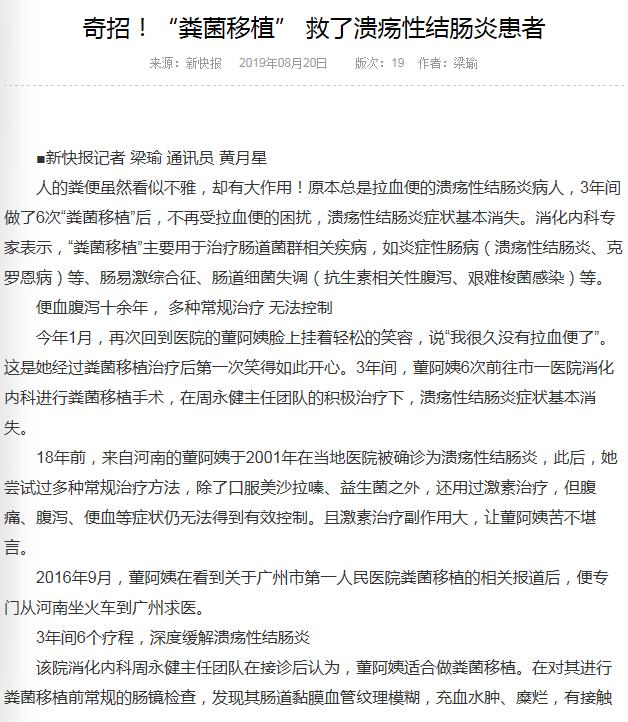 《新快报》:奇招!“粪菌移植” 救了溃疡性结肠炎患者 2019年8月20日A19版