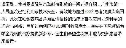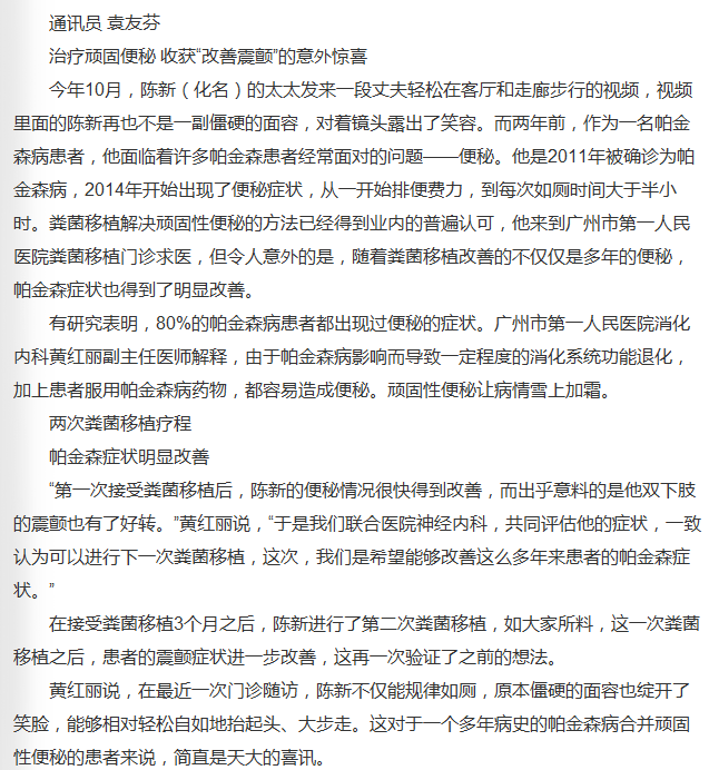 《新快报》帕金森病人靠粪菌移植治了便秘 还收获了意外惊喜2019年11月12日A20版
