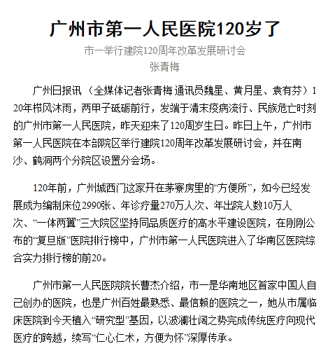 《羊城晚报》120岁的广州市一医院 正向科研型医院转型2019年11月12日A06版