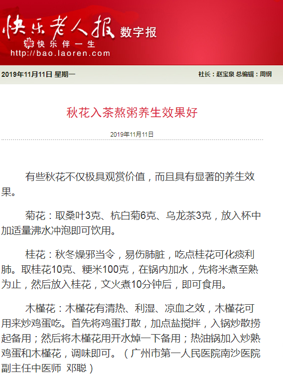 《老人报》秋花入茶熬粥养生效果好2019年11月11日A10版