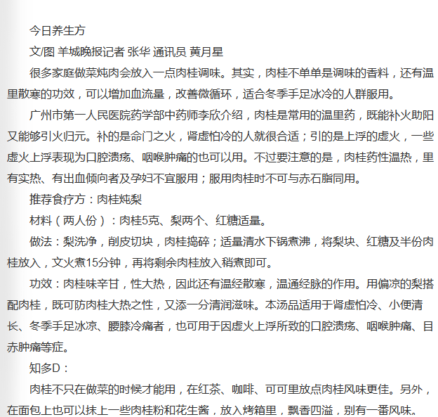 《羊城晚报》虚火上浮,试试肉桂炖梨2019年12月31日A18版