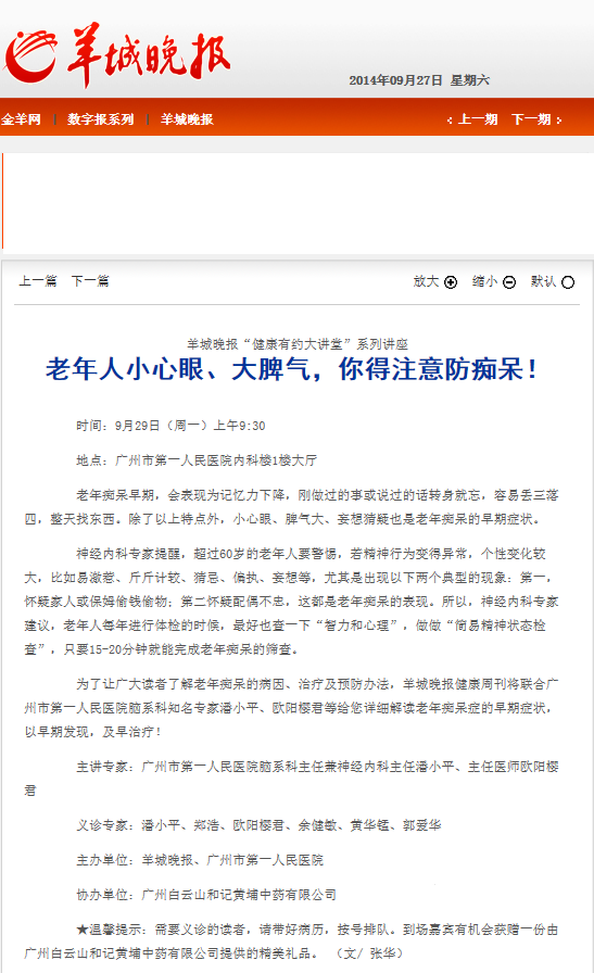 《羊城晚报》:老年人小心眼、大脾气,你得注意防痴呆! 2014年9月27日B12版