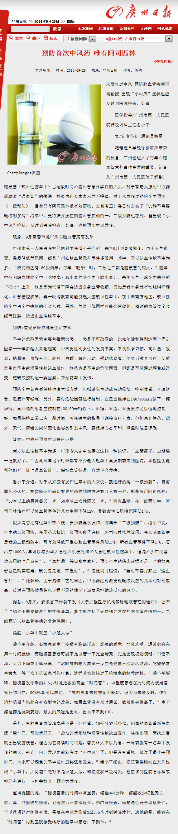 《广州日报》:预防首次中风药 唯有阿司匹林 2014年9月28日B08版