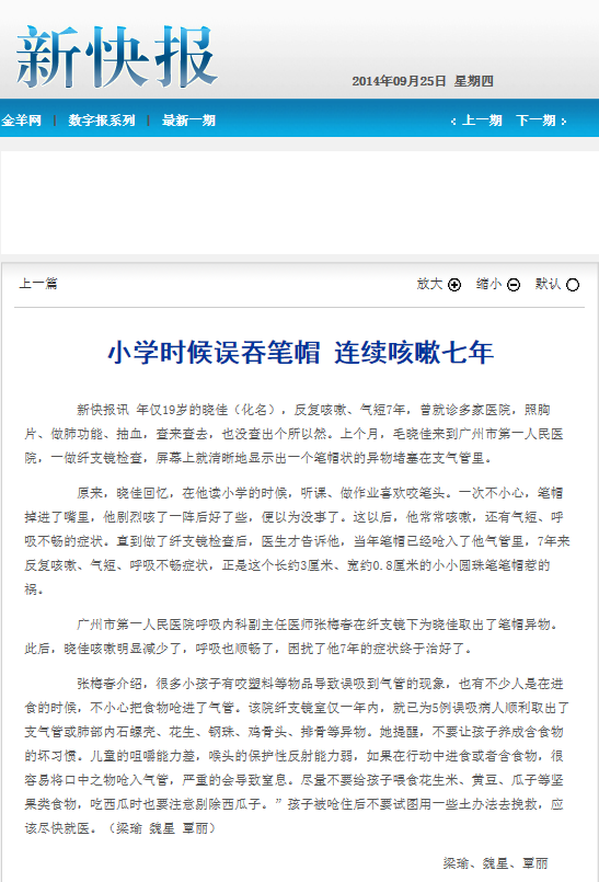 《新快报》:小学时候误吞笔帽 连续咳嗽七年 2014年9月25日D04版