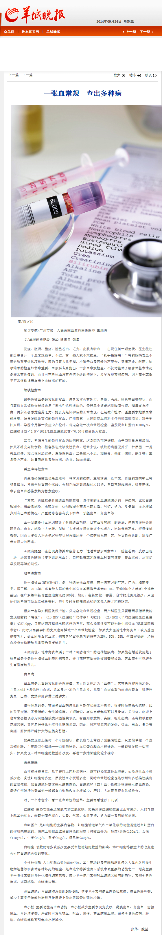 《羊城晚报》:一张血常规 查出多种病 2014年9月24日B07版