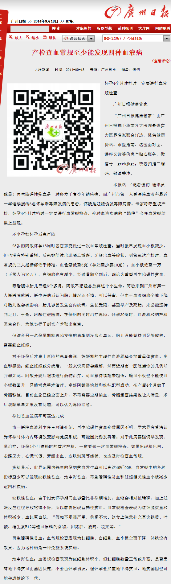 《广州日报》:产检查血常规至少能发现四种血液病 2014年9月18日B07版