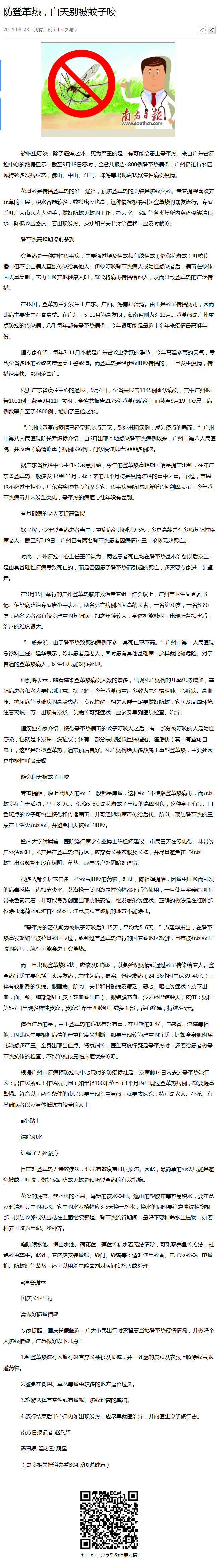 《南方日报》:防登革热,白天别被蚊子咬 2014年9月23日B01版