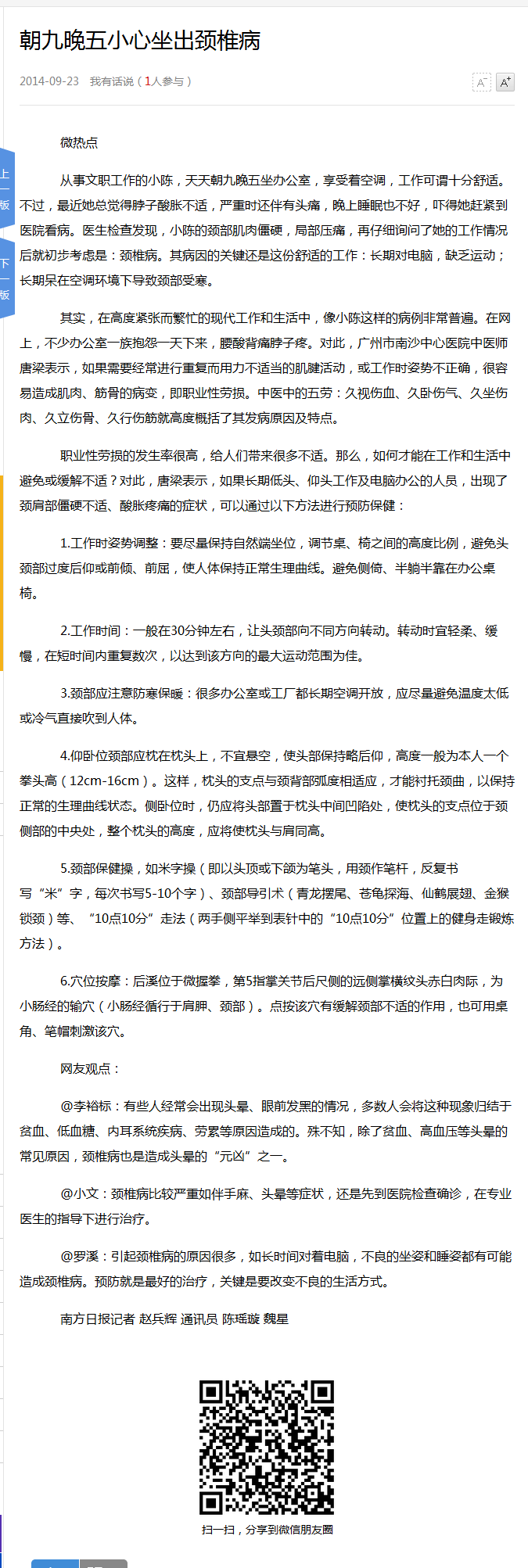 《南方日报》:朝九晚五小心坐出颈椎病 2014年9月23日B02版