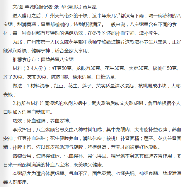 《羊城晚报》:健脾养胃,吃一碗甜糯浓稠的八宝粥,满足!2020年1月7日A27版