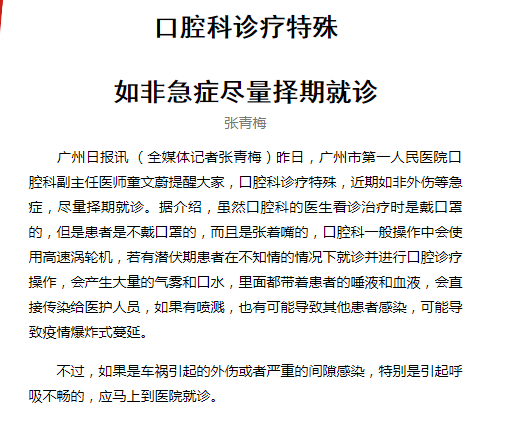 《广州日报》:口腔科诊疗特殊 如非急症尽量择期就诊 2020年1月27日A4版