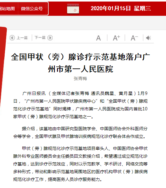 《广州日报》:全国甲状(旁)腺诊疗示范基地落户广州市第一人民医院 2020年1月15日A16版