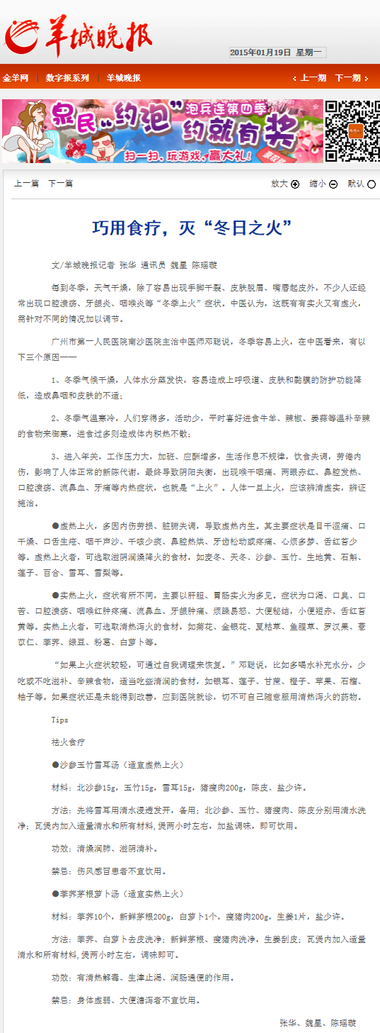 《羊城晚报》:巧用食疗,灭“冬日之火” 2015年1月19日B07版