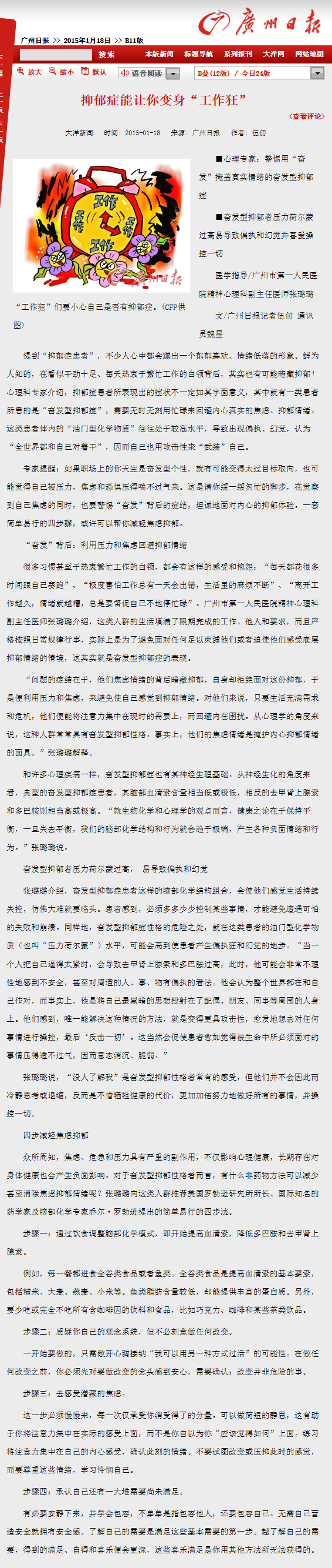 《广州日报》:抑郁症能让你变身“工作狂” 2015年1月18日B11版
