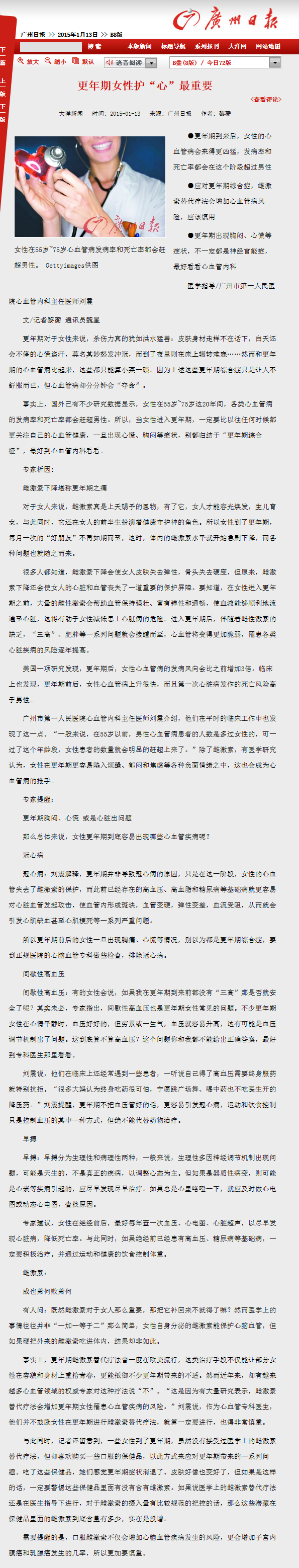 《广州日报》:更年期女性护“心”最重要 2014年1月13日B08版