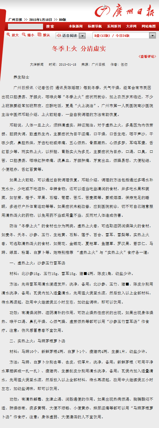 《广州日报》:冬季上火 分清虚实 2015年1月18日B09版