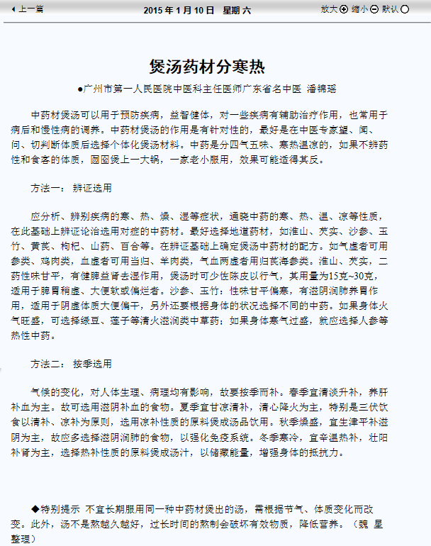 《健康报》:煲汤药材分寒热 2015年1月10日02版