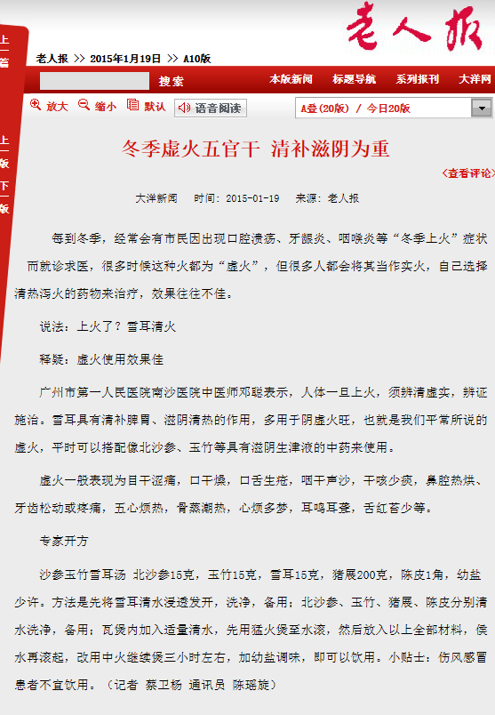 《老人报》:冬季虚火五官干 清补滋阴为重 2015年1月19日A10版