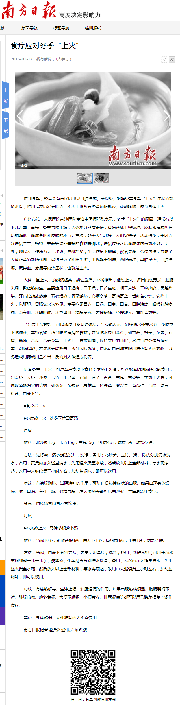 《南方日报》:食疗应对冬季“上火” 2015年1月17日A17版