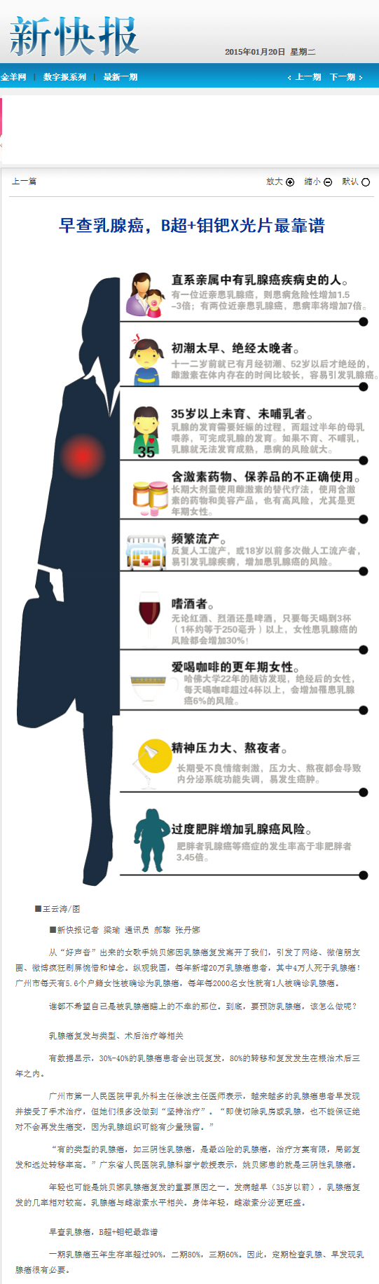 《新快报》:早查乳腺癌,B超+钼钯X光片最靠谱 2015年1月20日B11版