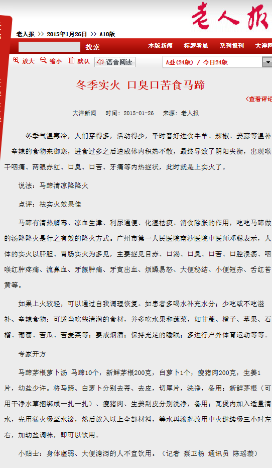 《老人报》:冬季实火 口臭口苦食马蹄 2015年1月26日A10版