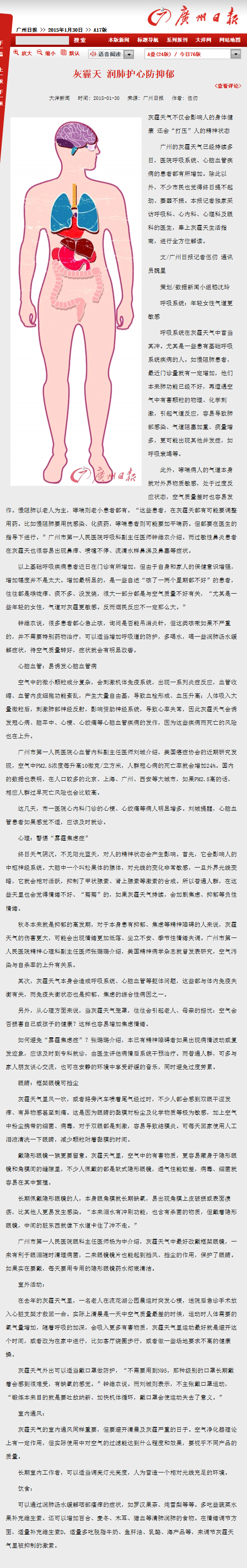 《广州日报》:灰霾天 润肺护心防抑郁 2015年1月30日A17版