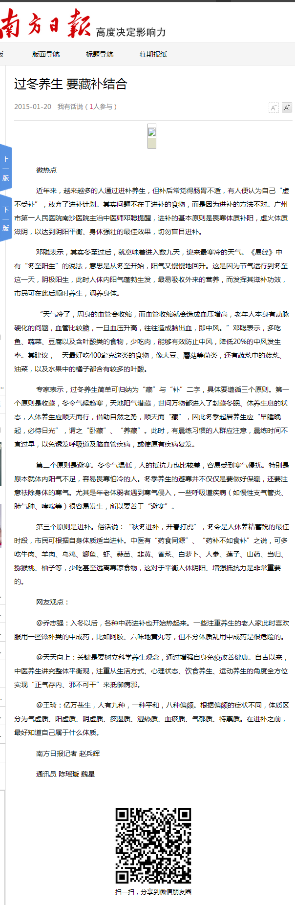 《南方日报》:过冬养生 要藏补结合 2015年1月20日B02版