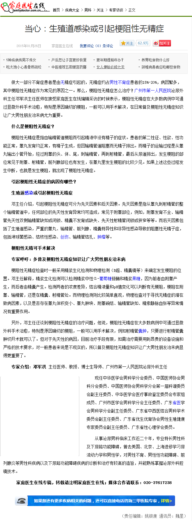 【家庭医生在线】当心:生殖道感染或引起梗阻性无精症 2015年1月26日专家访谈