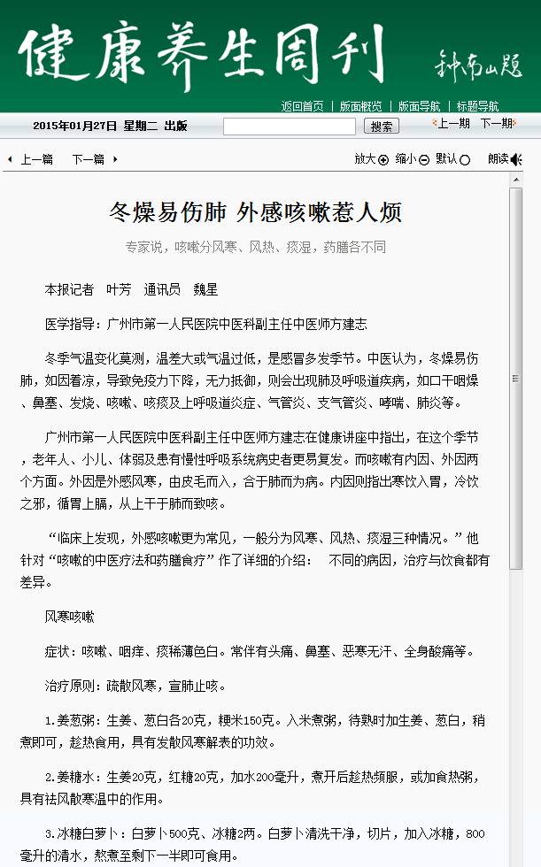 《健康养生周刊》:冬燥易伤肺 外感咳嗽惹人烦 2015年1月27日A05版