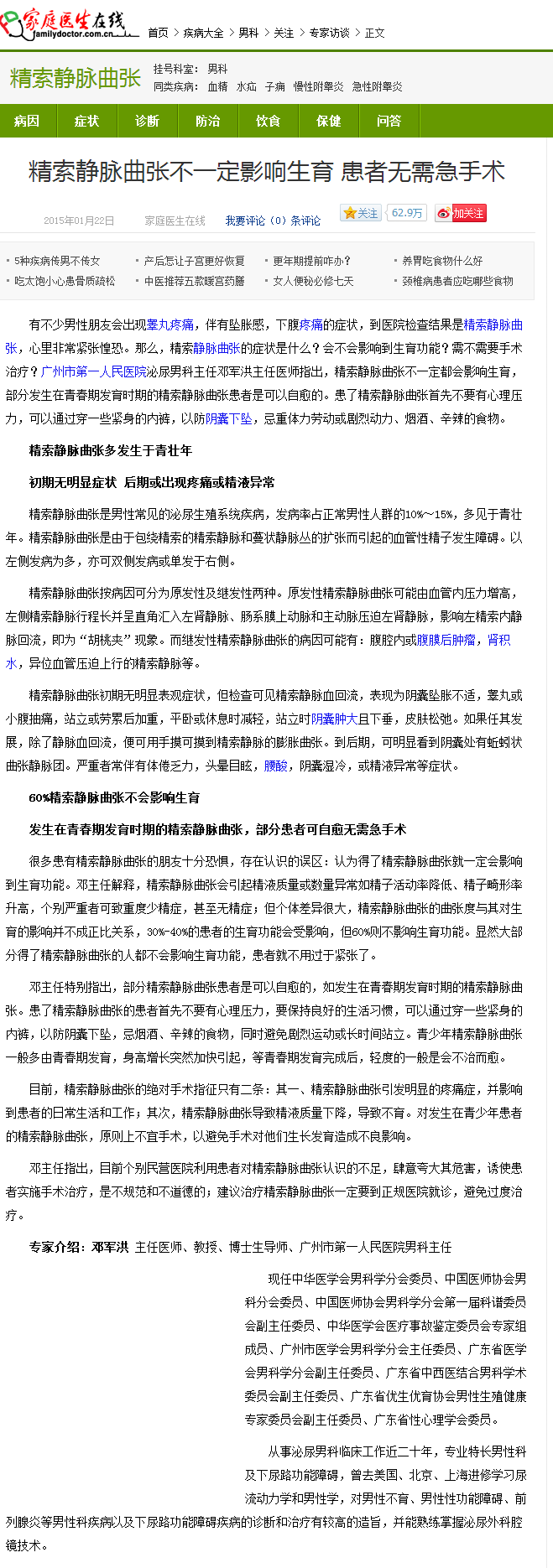 【家庭医生在线】精索静脉曲张不一定影响生育 患者无需急手术 2015年1月22日专家访谈