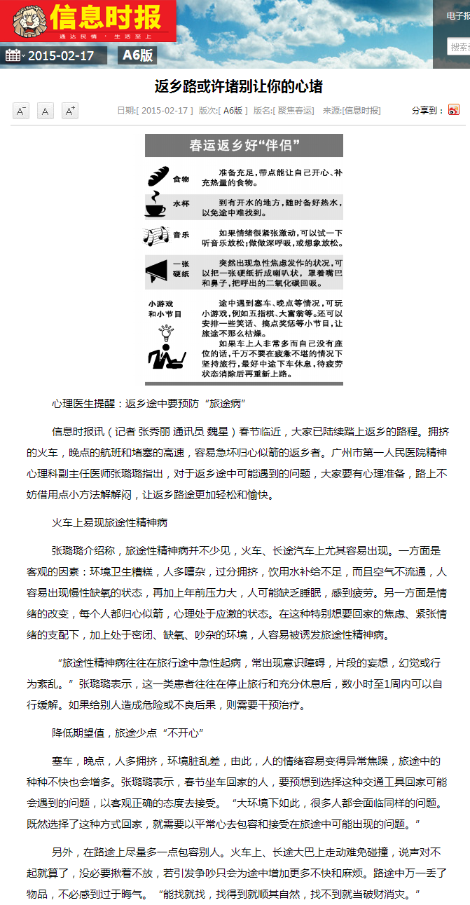《信息时报》:返乡路或许堵别让你的心堵 2015年2月17日A06版