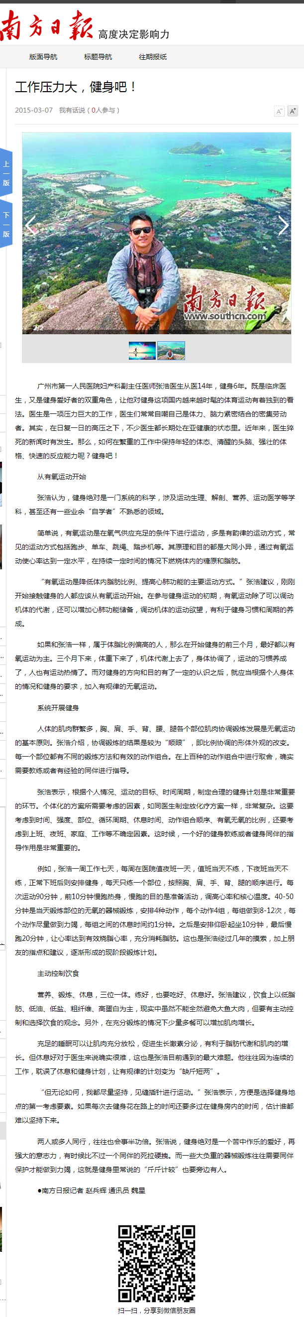 《南方日报》:工作压力大,健身吧! 2015年3月7日A25版