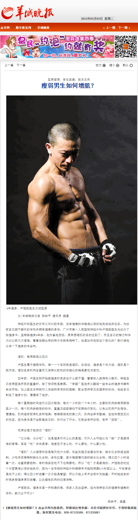 《羊城晚报》:瘦弱男生如何增肌?2015年3月3日B10版