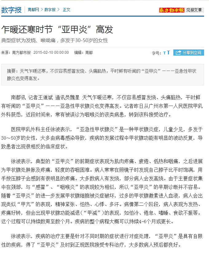 《南方都市报》:乍暖还寒时节“亚甲炎”高发 2015年2月10日GII06版