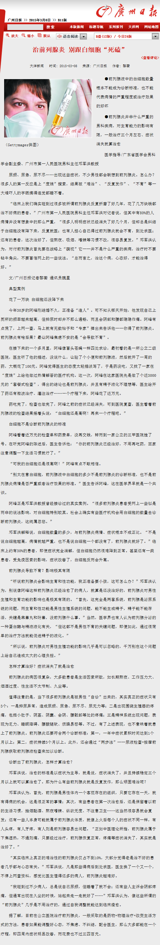 《广州日报》:治前列腺炎 别跟白细胞“死磕” 2015年3月8日B11版