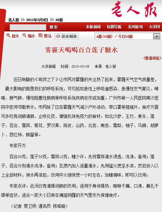 《老人报》:雾霾天喝喝百合莲子糖水 2015年3月9日A08版