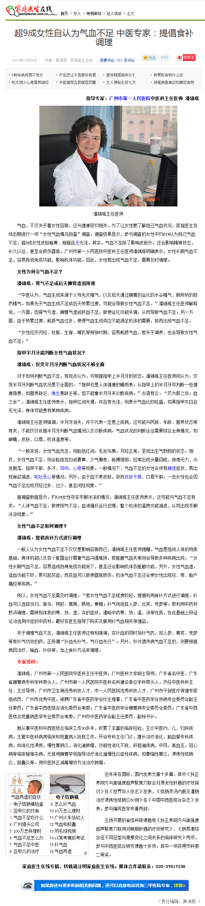 【家庭医生在线】超9成女性自认为气血不足 中医专家:提倡食补调理 2015年3月4日达人访谈