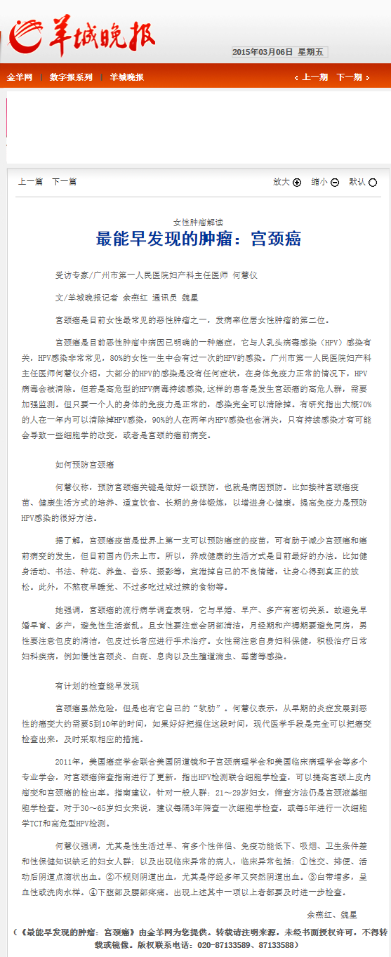 《羊城晚报》:最能早发现的肿瘤:宫颈癌 2015年3月6日B06版