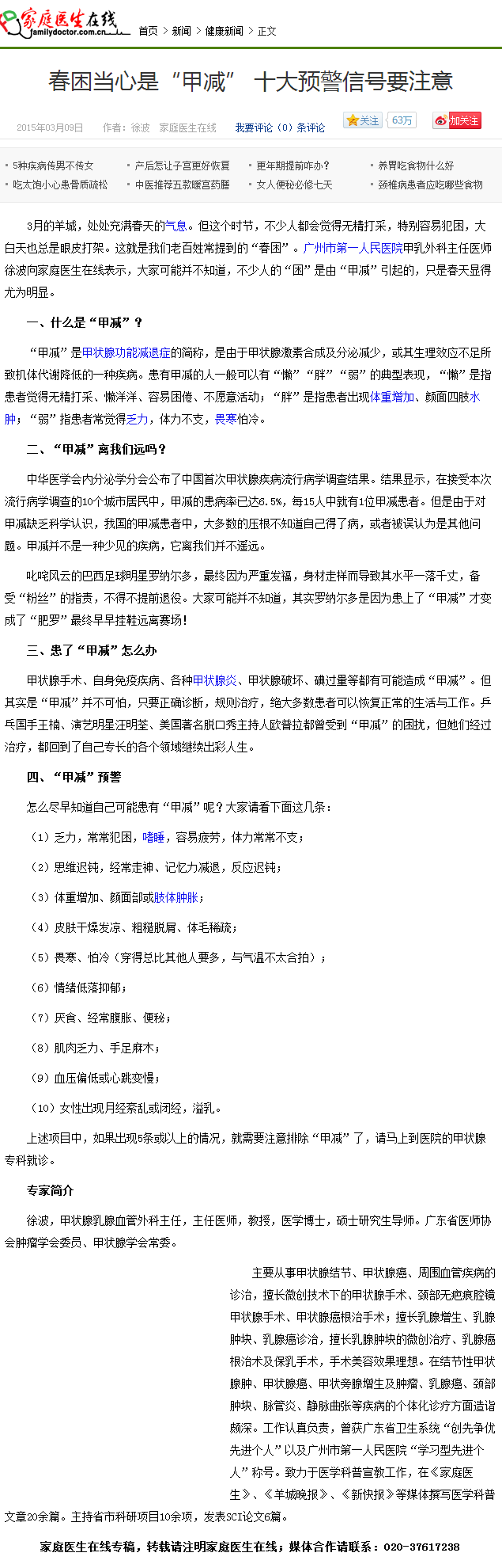 【家庭医生在线】春困当心是“甲减” 十大预警信号要注意 2015年3月9日新闻
