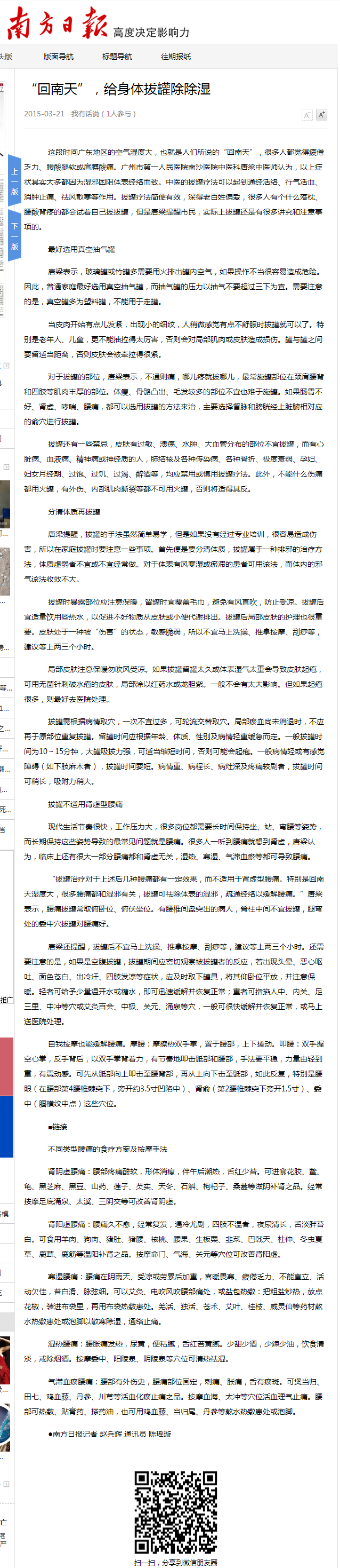 《南方日报》:“回南天”,给身体拔罐除除湿 2015年3月21日17版