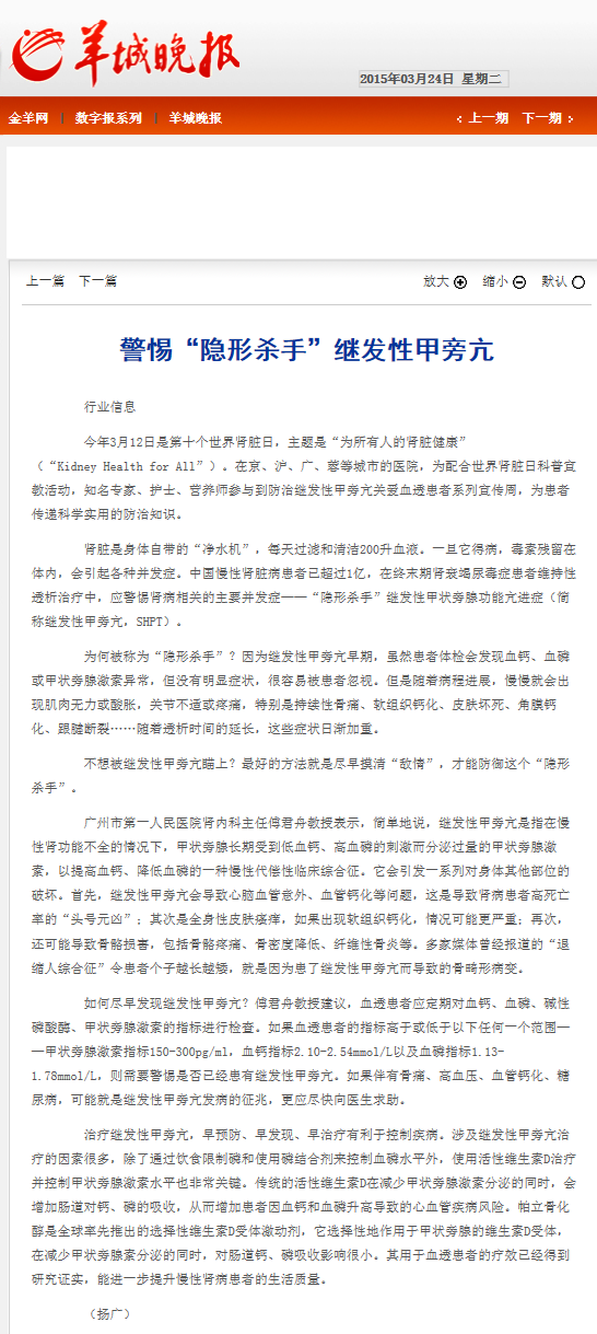 《羊城晚报》:警惕“隐形杀手”继发性甲旁亢 2015年3月24日B09版